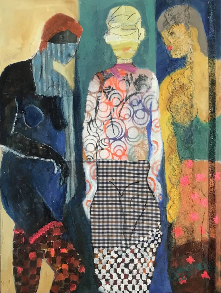 Three women, meeting, talking to each other. This painting arose while playing with collage of textile, lace and spray-paint.