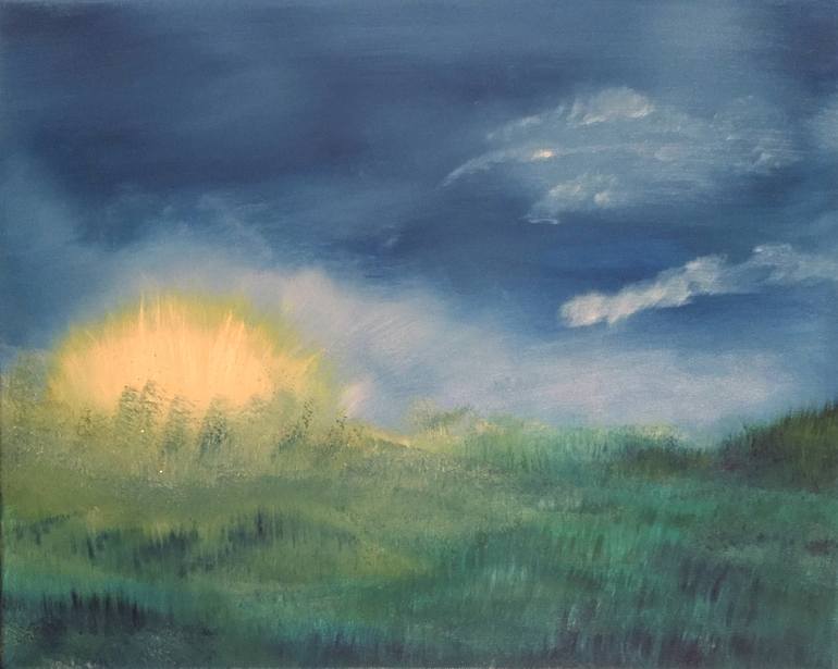 A pretty, minimalistic abstract painting of a sunny day in a green field filled with whatever your imagination tells you is there. It is unlimited and endless what is in this painting, all you have to do is look for it! It will brighten any space of your home or office, even when it's rainy or sno...