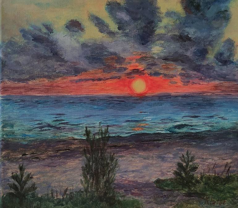 A vibrant and juicy sunrise over a tranquil sea is how the artist captures the beauty of a summer morning in the picturesque corner of Apsuciems. The interplay of light and shadow, the smooth transitions from violet to orange create a unique atmosphere of the beginning of the day. Painted en plein a...