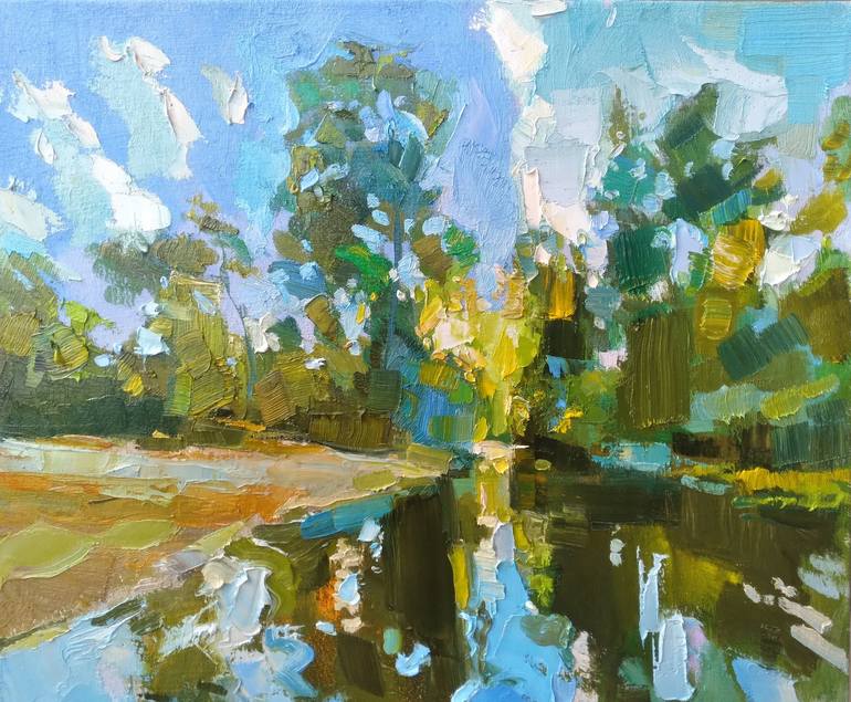 THIS PAINTING IS CURRENTLY EXHIBITED AT A BRICK-AND-MORTAL GALLERY TILL APRIL 1,2024. Original oil on canvas painting stretched on a wooden frame. Contemporary landscape painting in the impressionistic traditions. Sunset and reflection through the woods. Impasto. Bold. Bright. Master-quality mate...