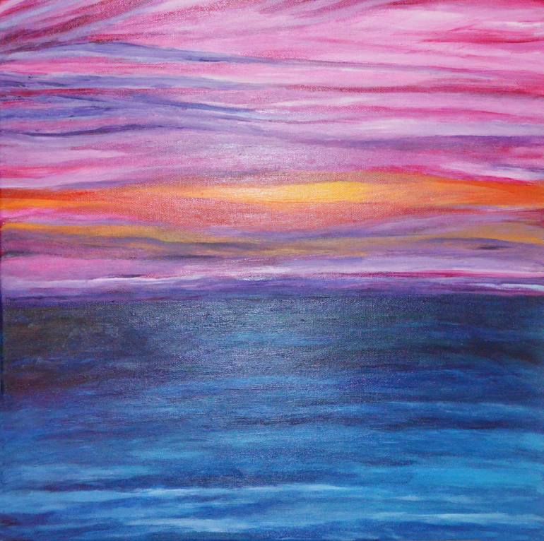 I created this piece to show the pink, orange, yellow, blue, purple color combination. I wanted to show movement in the sky and the ocean. I wanted it to be abstract in appeal. I used acrylic paint on gallery wrapped canvas. 20" x 20".