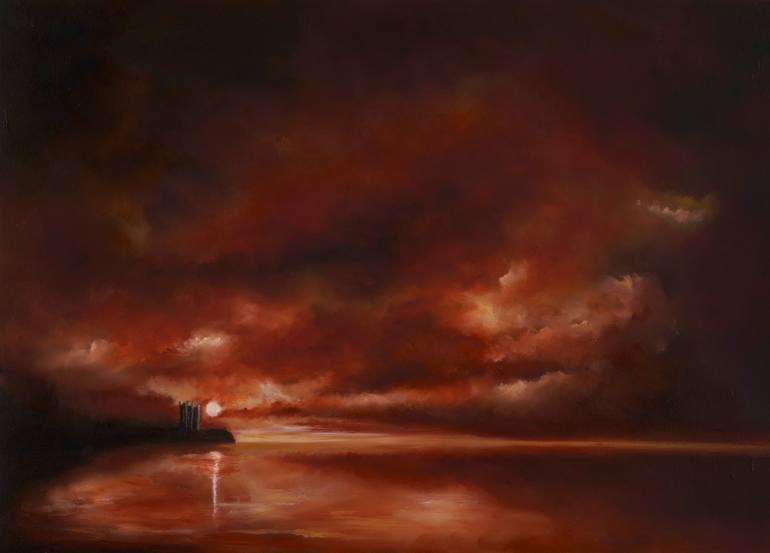 A dramatic evening off the coast of Scotland with Keiss Castle still standing against the sunset. An oil painting on oil paper with the border left on for ease of framing.