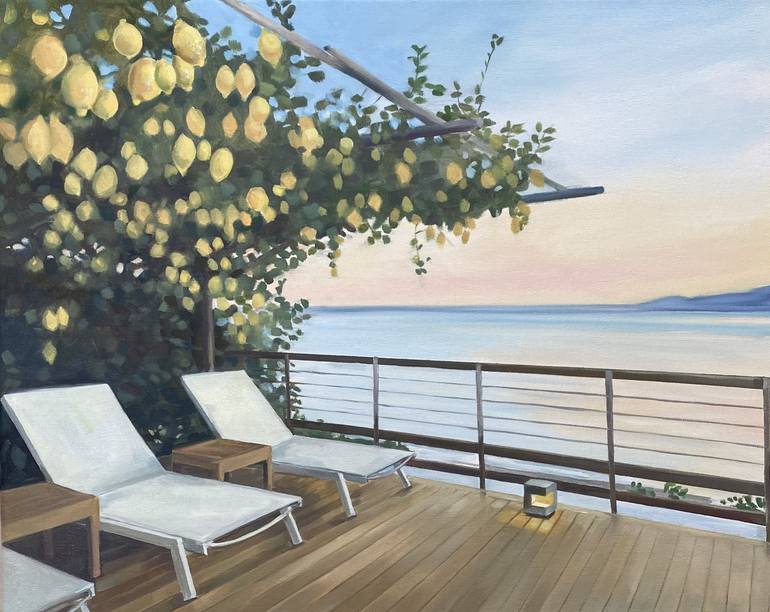 An atmospheric oil painting of a sunset under the Lemon Pergola at Casa Angelina, The Amalfi Coast, Italy. Inspired by a photographic taken by the customer who commissioned this oil painting.
