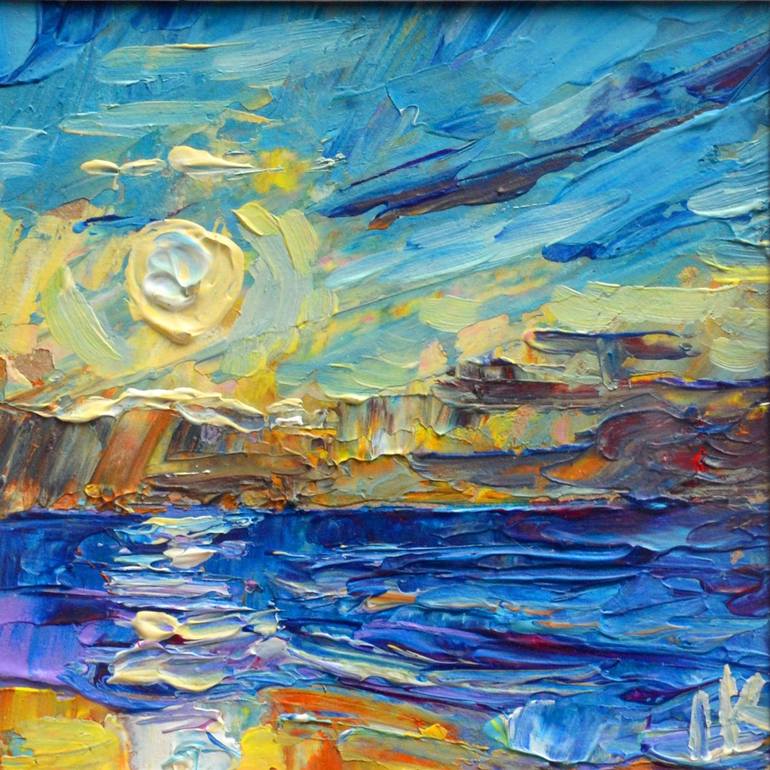 This is an original acrylic painting, hand-painted on cardboard, and is part of the "Sunset Miniature" collection. Each piece in this collection is thoughtfully crafted to capture the fleeting beauty of nature, particularly the mesmerizing colors of sunsets over water. The artwork comes with a pape...