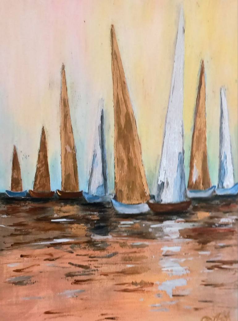 Embark on a serene voyage with "Sunset Sails," a minimalist acrylic painting capturing a row of sailboats with brown sails gliding across tranquil waters under a luminous orange and pink sky. This piece draws inspiration from the ethereal style of Tanya Shatseva, known for her surreal and dreamy com...