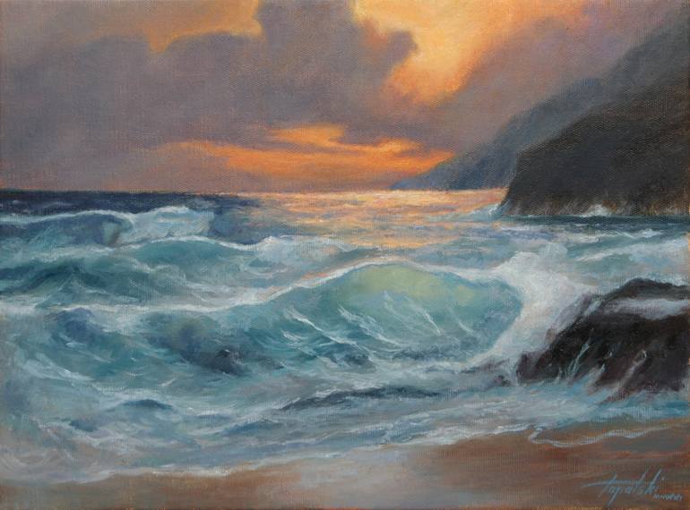 Medium: Oil Support: Canvas Size: ±12X16in. (30X40cm) Year: 2021 Signed: Yes All materials are archival! "Sea, waves, seashore, oceans are always so inspiring especially with the nice sunset colors. Sides of the painting are painted as well." I provide a signed certificate of authenticity (COA). D...