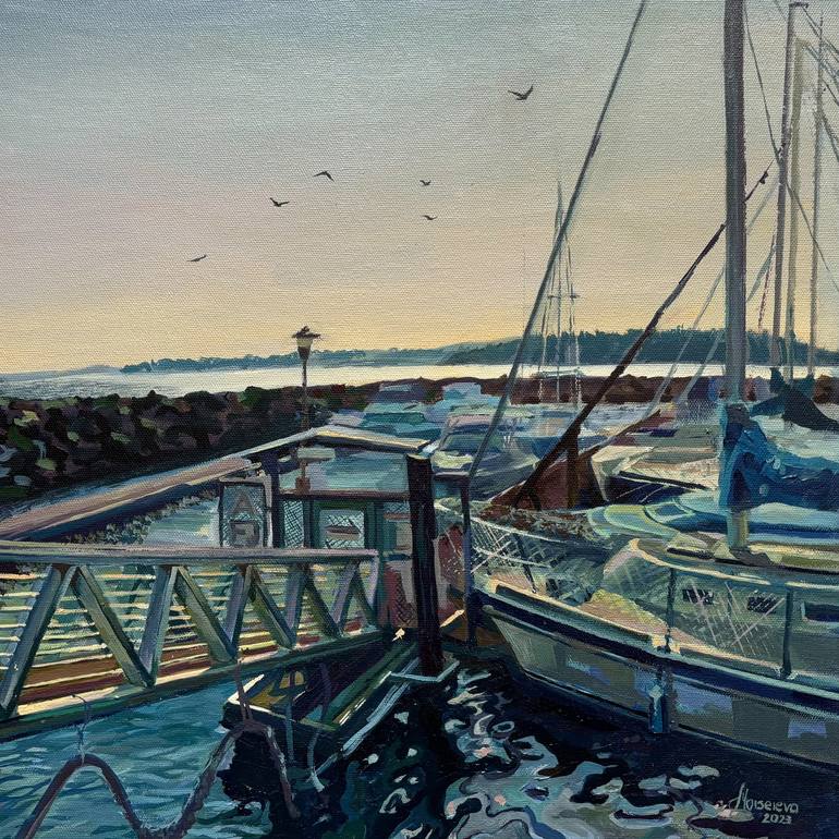 This oil painting on canvas, coated with lacquer, portrays a marina with yachts and boats at sunset. In the foreground, a dock leads to the marina with moored yachts, while the sun sets in the background, casting a warm glow over the scene. The water reflects the scene with a blurred reflection, and...