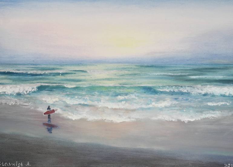 Original oil painting, surfer, surfing sports, oceanview, seaview, blue water, tropical, sunset. Would be nice present for person who loves surfing. I took the oceanscape from SanDiego. Framed in gray modern frame with silver pattening.