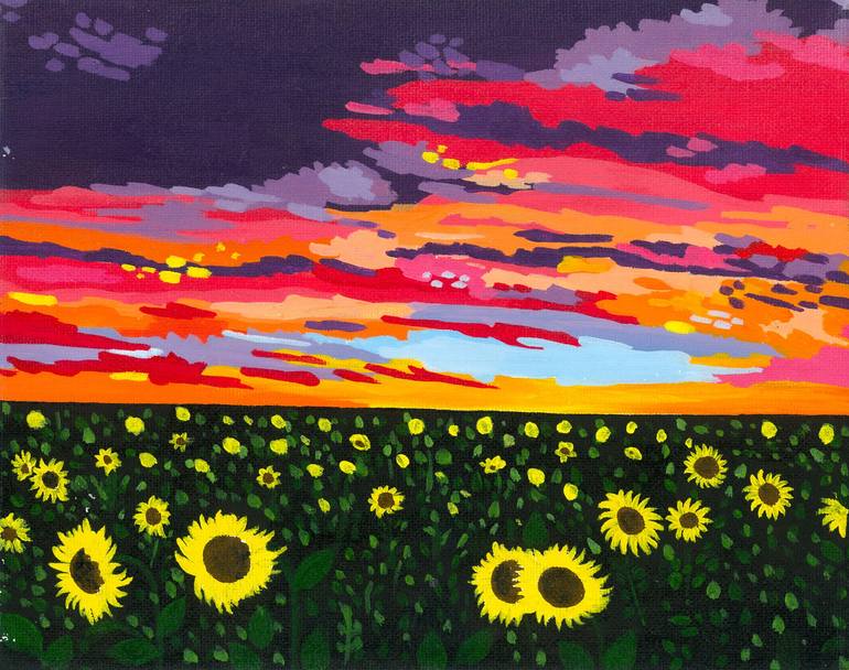 This painting is originally made with acrylics on a 8 x 10 inches canvas. Skies with unusual colors and sunflowers are one of my favorite things to paint. You can always choose the frame of your own choice and color to match your interior. Contact through email or instagram page for further queries.