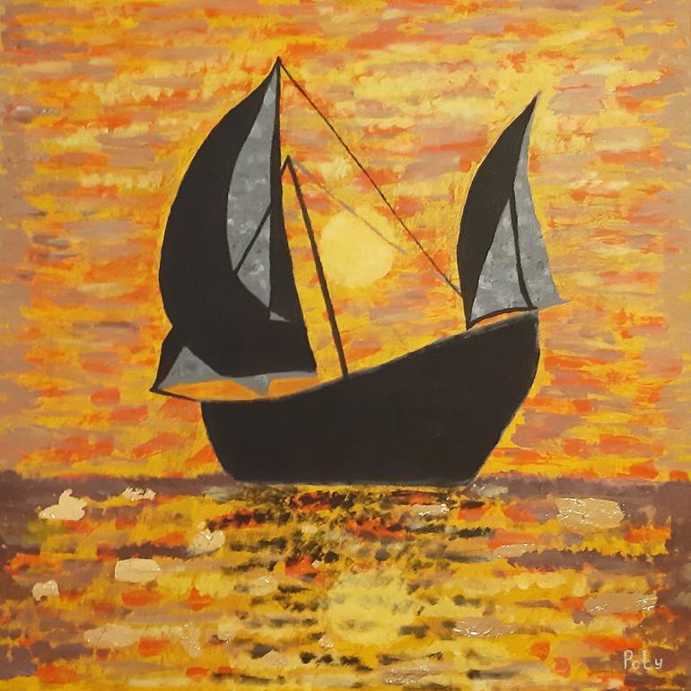Wonderful sunset at sea and ship. This painting on linen canvas with gold leaf embodies the carefree relaxation of body and soul, away from the hustle and bustle. A beautiful summer sunset is reflected in the warm sea. Contemporary painting in the style of impressionism. Gold leaf helps show the bri...