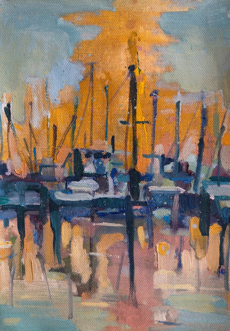 This is a small painting I made with acrylic and oil colors on a small piece of canvas (flat, not stretched). I had just returned from vacations and the sea never leaves me without inspiration for a marine painting. Boats, ports and fishermen are a usual theme depicted by the Greek painters.