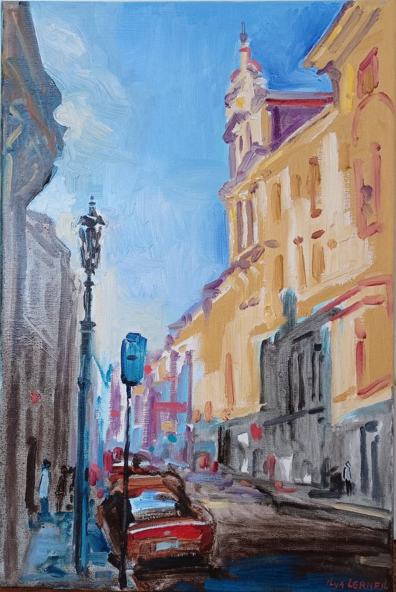 This painting is based on image from Old City of Prague which I visited in March of 2022. This scene attracted my attention by its unusual composition and bright light. My deeply personal style incorporates unconventional composition, vivid texture, gestural painting marks, emphasized color and oth...