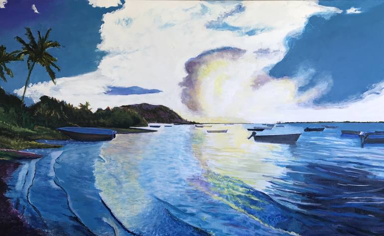 The beautiful beaches of the Venezuelan Caribbean are reflected in this spectacular sunset. The effect that this seascape, in reality, produces on the viewer is replicated in this painting in which the first impression is to close the eyes to withstand the glare of the sun