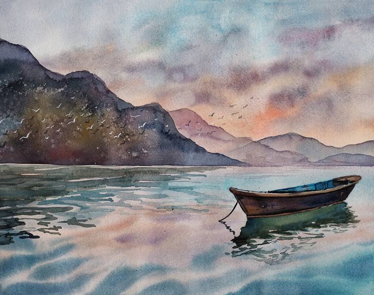 Sunset on Phewa lake - original watercolor landscape from Nepal-trip Print