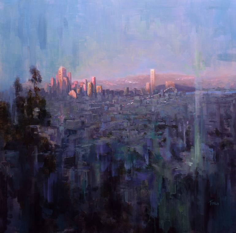 Painted from views from Bernal Heights in San Francisco. Continuing my exploration of the line between abstraction and inner luminosity, this piece furthers the progression that has emerged over the last few years. Oil on stretched linen. This is on deep 1.5 inch stretcher bars with painted sides...