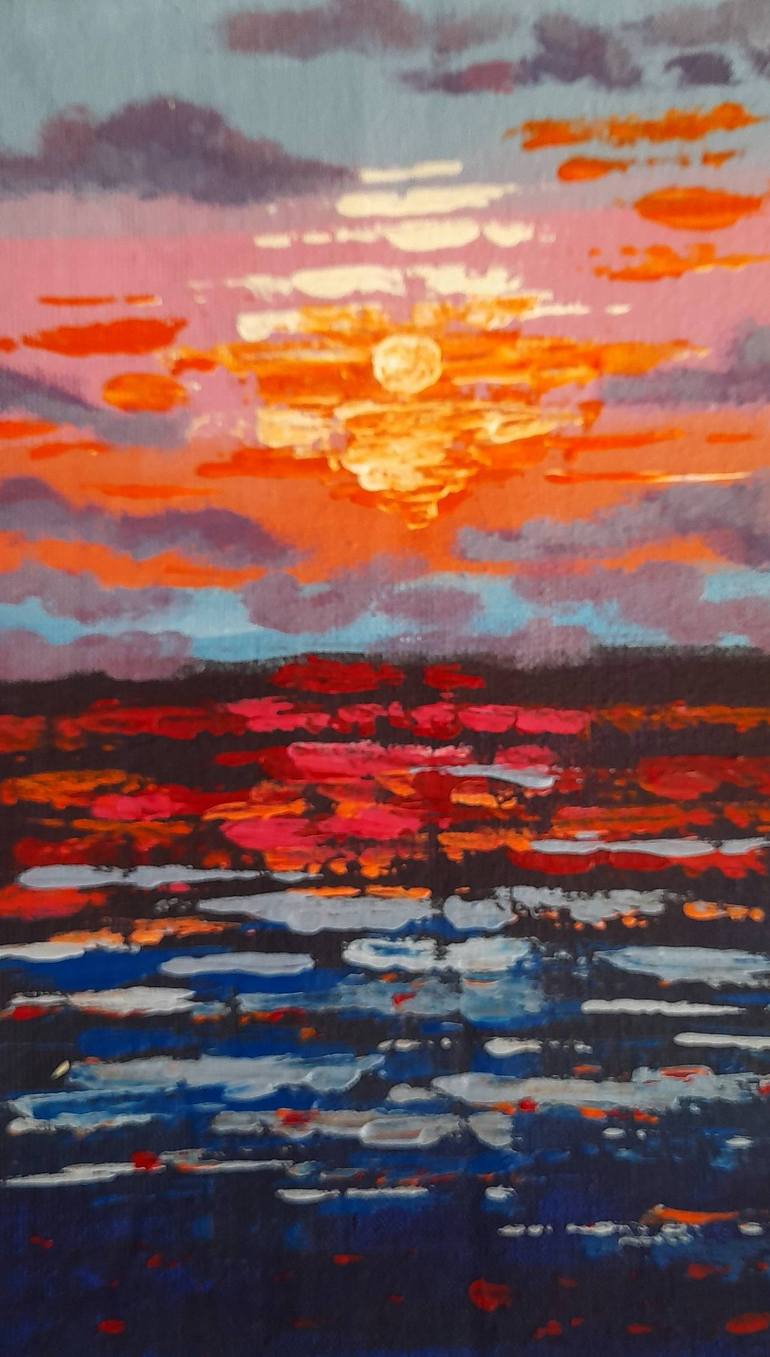 13 by 23 cm painting. (May be small errors, manual measurement) * Materials - acrylic paints, cardboard cotton canvas, varnish.