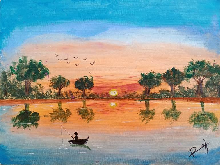 "evening twilight " captures the tranquil beauty of a coastal sunset as it gently embraces the horizon. The painting, rendered with skillful brushstrokes and a delicate palette, portrays a picturesque scene of a fishing boat gliding gracefully across the rippling waters of the sea. The sky is a bre...