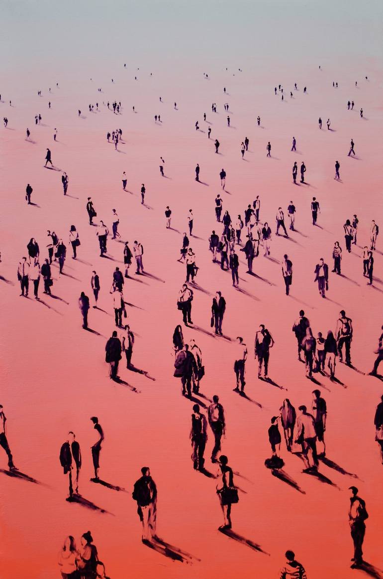 This painting is part of monochromatic series of artwork I painted in 2020. The landscape is completely abandoned and created with gradient background. This way all attention is only aimed to people. Bird's eye view perspective is giving a space and freedom to imagination to who is observing. The pa...