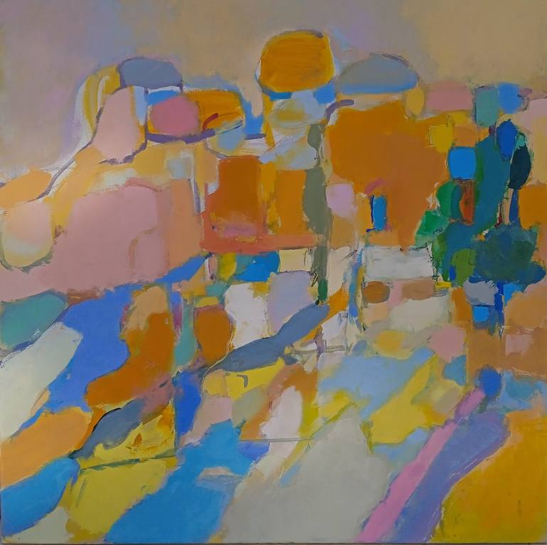 The city at our feet... fading in the heat haze. Semi abstract painting in warm pastel colors.