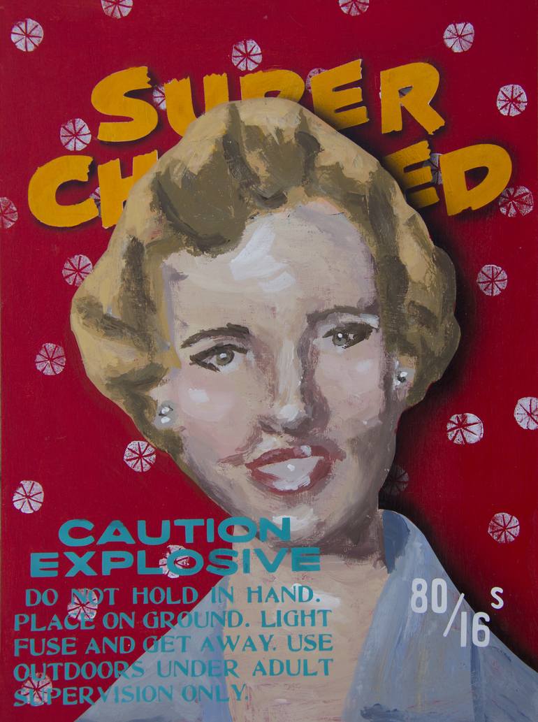 This artwork is an acrylic and ink painting on a wooden panel. It features a loosely painted portrait based on a vintage yearbook photo with text based on old firework labels.