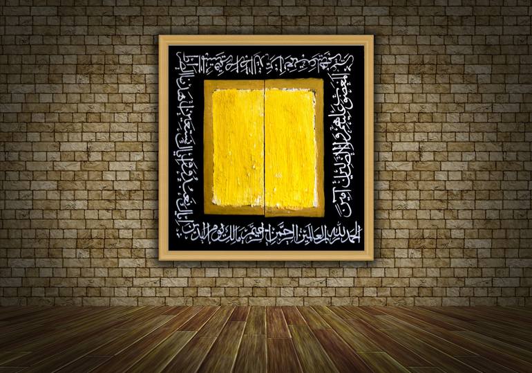 In this painting, I have present the Calligraphic art work over Islamic art at Surah Al-Hamd. In center I use Yellow color to get attraction to the painting side and I cover whole squares beautifully with Surah Al hamd.