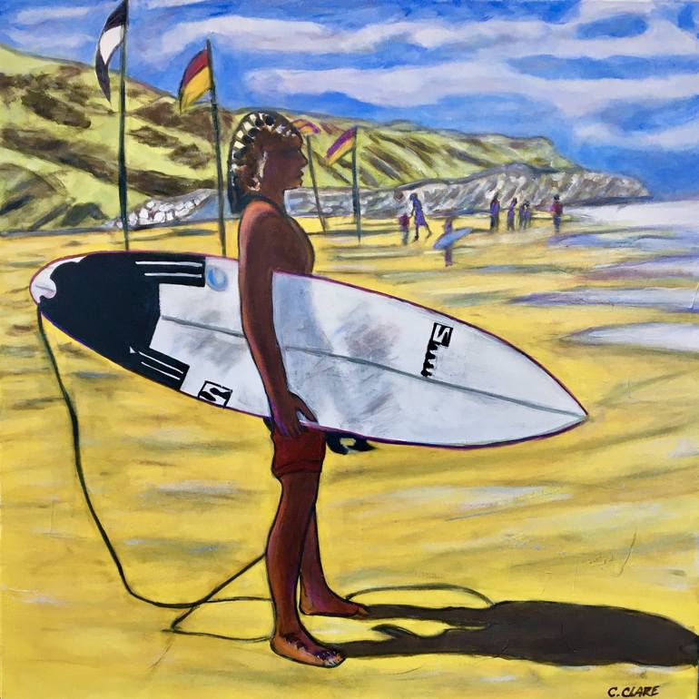 This vibrant work depicts a contemplative young surfer on a sun-drenched beach, holding his board with determination. The meticulous realism of color and form creates an instantly captivating atmosphere. The sky, dotted with light clouds, contrasts harmoniously with the golden tones of the beach. ...