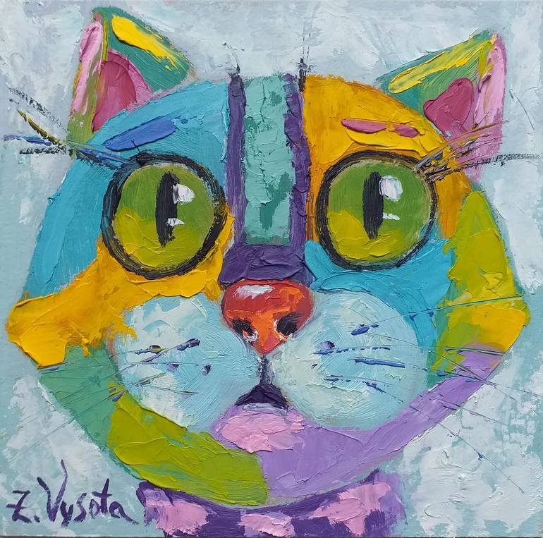--- Surprised cat. The cat woke up in the morning and looked at himself in the mirror. He immediately realized that living with the artist is very fun. ---- Unique and exclusive 100% hand-painted, Made in oil on cardboard and covered with a layer of varnish. ---- This painting is not fr...