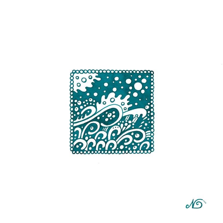 Sea foam and waves under the moon. Bright blue ink drawing on paper. Ornated and stylized oceanic waves and moon in the night sky.