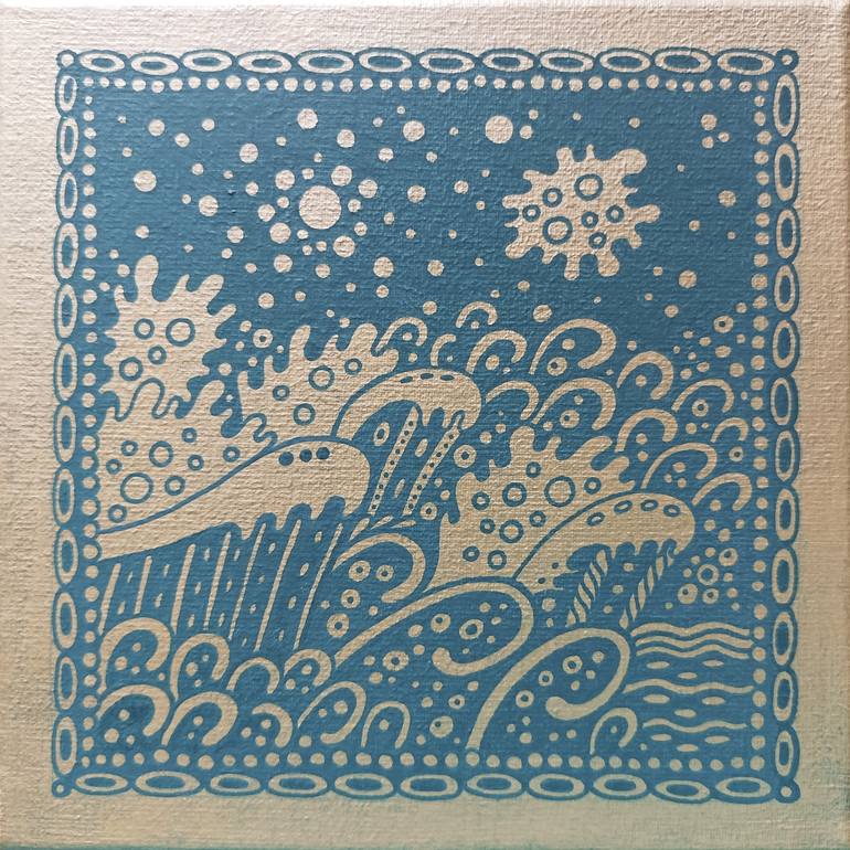 Ocean Waves - acrylic painting on a tiny canvas. Ornated abstract oceanic waves and the night sky on the pearl beige background.