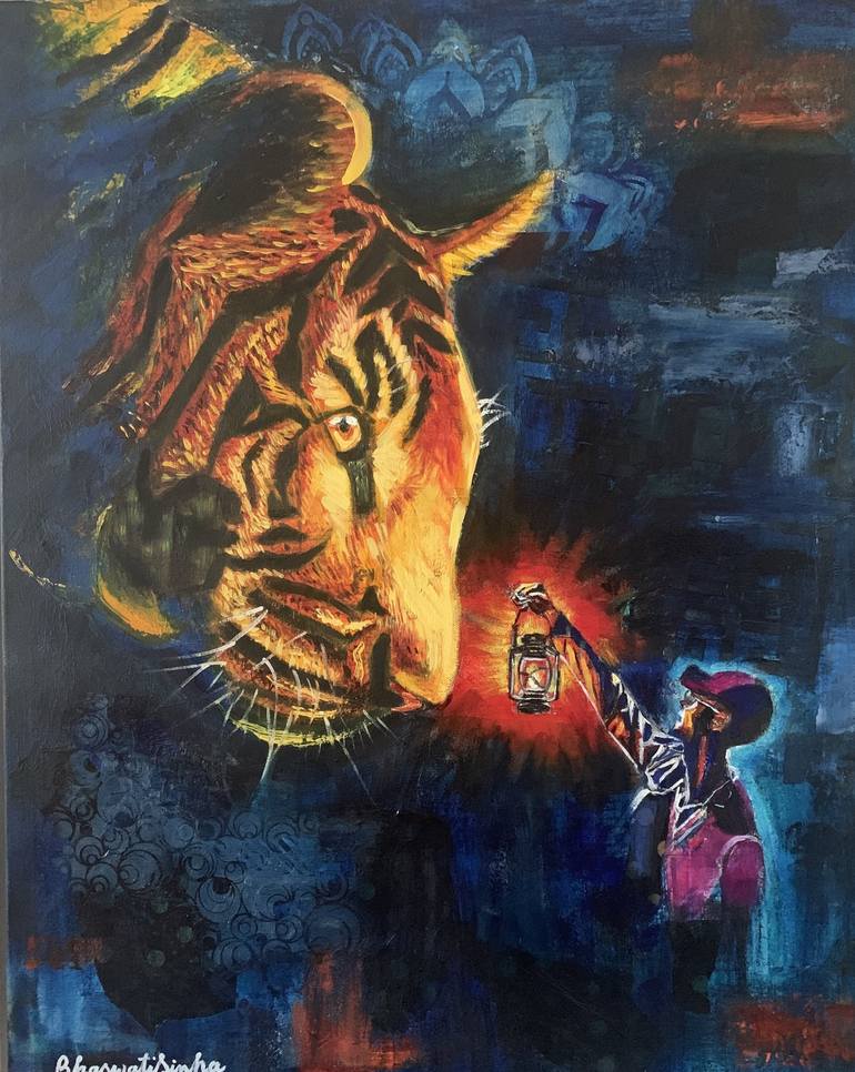 Survival depicts how the tiger is looking down to humankind for their survival and human looks up to tiger for conservation of ecosystem. Both are dependent on each other to balance the ecosystem of earth. The painting is in Gallery Canvas with various mediums used like collage to bring mystery, acr...