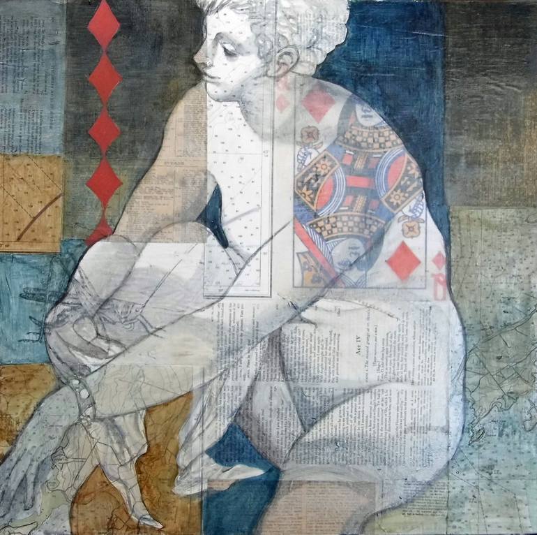 Vintage paper collage with book pages, maps and the queen of diamonds. Layered painting of classical nude woman based on Susanna and the Elders by Tintoretto c.1555. On cradled birch plywood panel, edges painted black, wired and ready to hang.