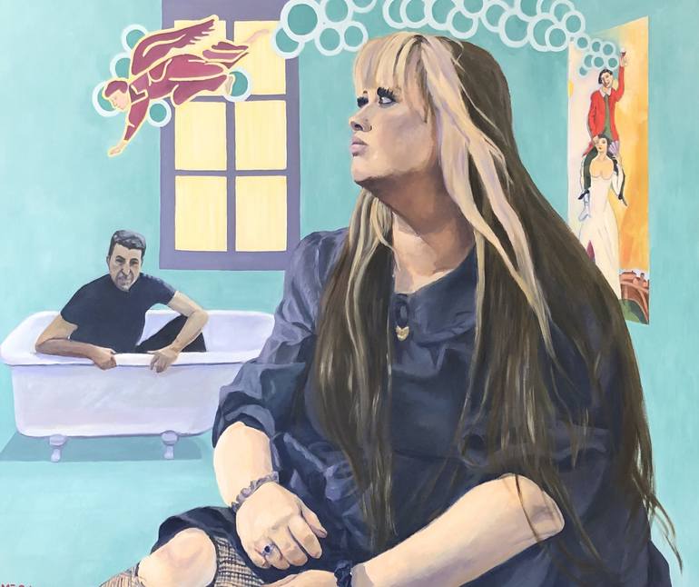 I was inspired by a song by Leonard Cohen and I set the scene in a room where the singer-songwriter is portrayed on the left and inside a small bathtub, while in the foreground there is Suzanne, with dreamy look and broken socks, but composed like Monnalisa, behind her a painting by Chagal "Double p...