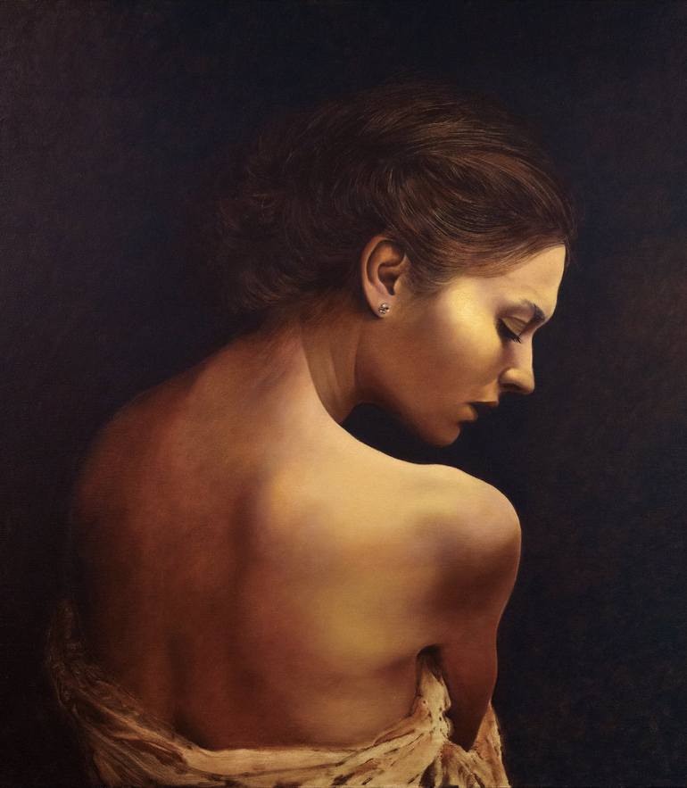 In this oil painting on canvas the woman is the central focus, her body turned slightly away from the viewer, her head bowed. Her back is bare, and she appears to be partially draped in a light-colored beige or off-white fabric that is loosely gathered around her shoulders. Her hair is dark brown an...