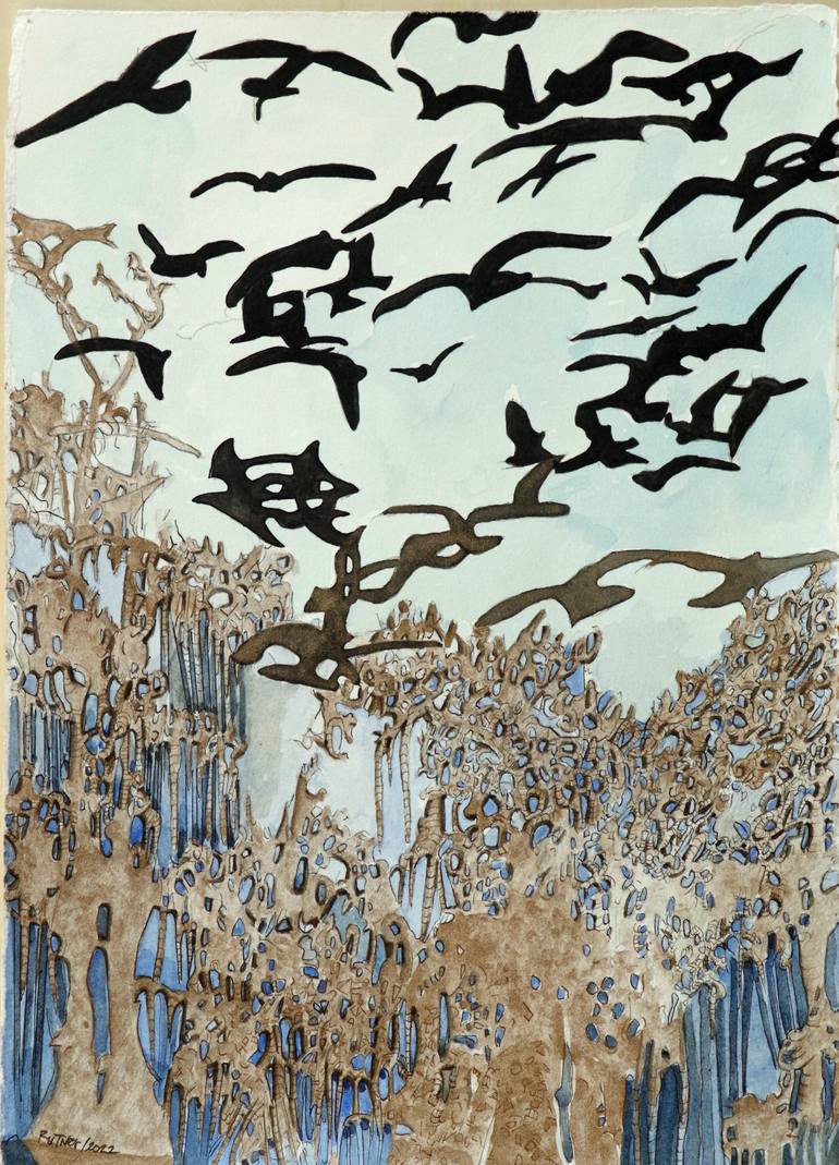 The body of work exhibited in this East Austin Studio Tour was inspired by my recent Spring 2024 trip to the island of Milos in Greece. This group of watercolor paintings was created after spending a month exploring Milos and visiting Athens. My work is divided into three categories: historical, architectural and landscape. I spent days investigating the historical contents of several museums in Athens and Milos. I was drawn to the designs painted on pottery fragments and decided to enlarge them and place them together in a composition. The early Greek Cycladic pottery figures were unlike any I had seen before and specifically representative of certain Greek islands. During my stay in Milos, I wandered through different neighborhoods in the port village of Adamas, returning to a few buildings that had an evident sculptural quality. I was interested in the stark linear shapes against the blue sky and angular white surfaces with windows and doors often accented by a solid blue color. The third category that grabbed my attention was the rugged, carved volcanic landscape all around Milos. I explored the moon-like landscape of Sarakinikos and also found impressive cliffs, rocky structures and caves during a yacht trip around the island. These stood out against the spectacular bluegreen Aegean Sea that surrounded them and the unobstructed view of a changing sky. My work focuses on shapes and forms, exploring relationships in space, and juxtaposing colors and textures to create tension. My most recent series of pen and ink drawing and watercolors on Fabriano paper are all examples of being motivated by plant shapes in nature, birds in flight and abstractions of them to create specific moments in time or to magnify a portion of what the viewer sees.