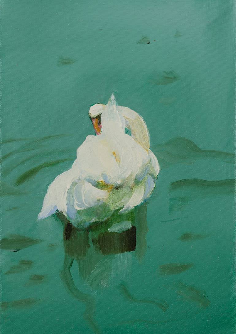 A miniature painting inspired by the unusual shape of a swan. The white sculpture of a swimming bird contrasting with the dark plane of the sea became a challenge for me to study the lightness of expression. This is one of the five works in this series.