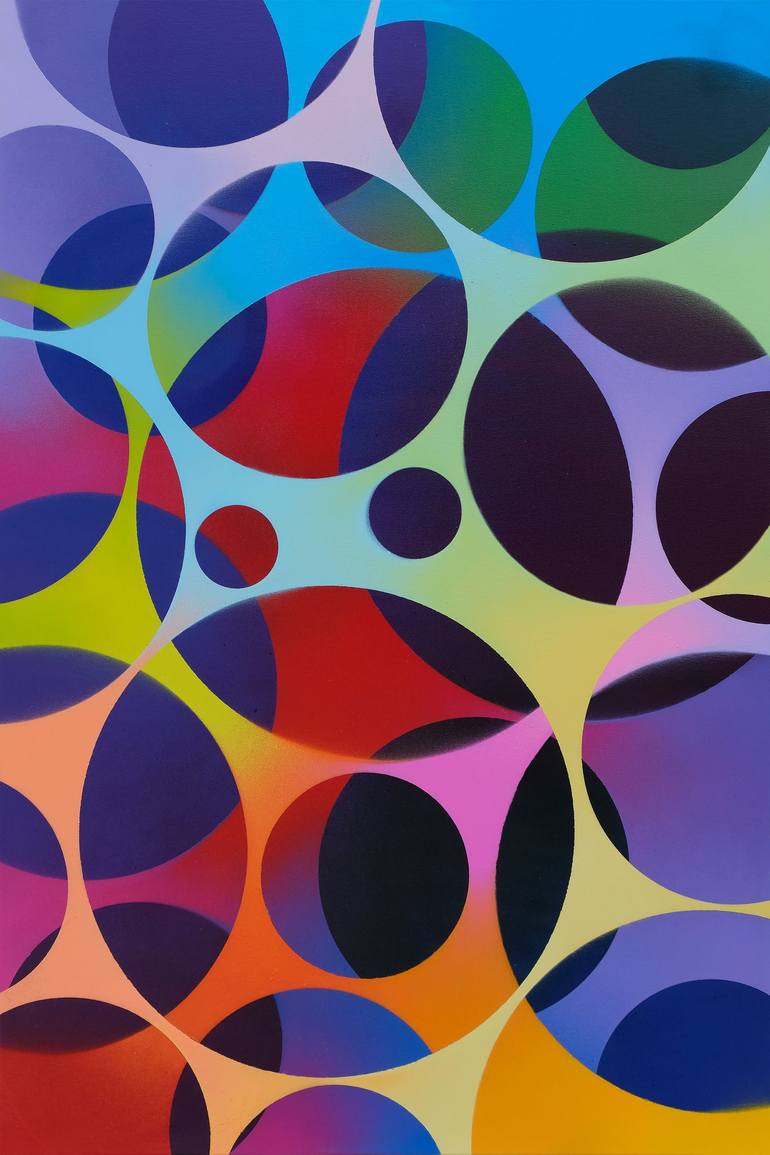 The painting "Sweet Fantasies" from the "Levels" series, created with spray paint, immerses us in a world of vivid and shimmering images that arise when we indulge in fantasies. The multitude of intersecting circles and rich color gradients symbolize the diversity and richness of imagination, capabl...