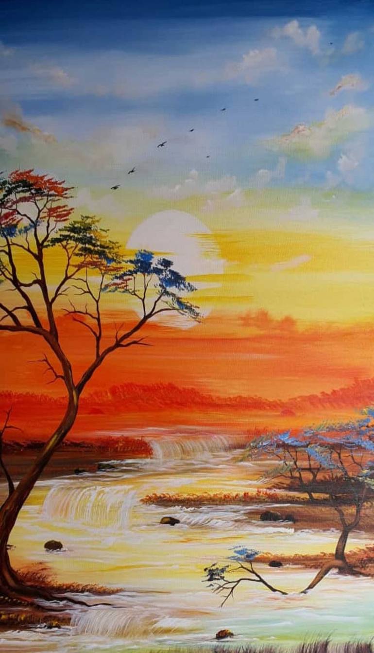 Original landscape paintings for sale by artist Ema Kato. Artwork inspired by the beauty of landscapes and the appearance of the sunrises in the world. This large sized painting was created on artist canvas using acrylic paint and it's a depiction of the beautiful colors that showcase in the landsca...