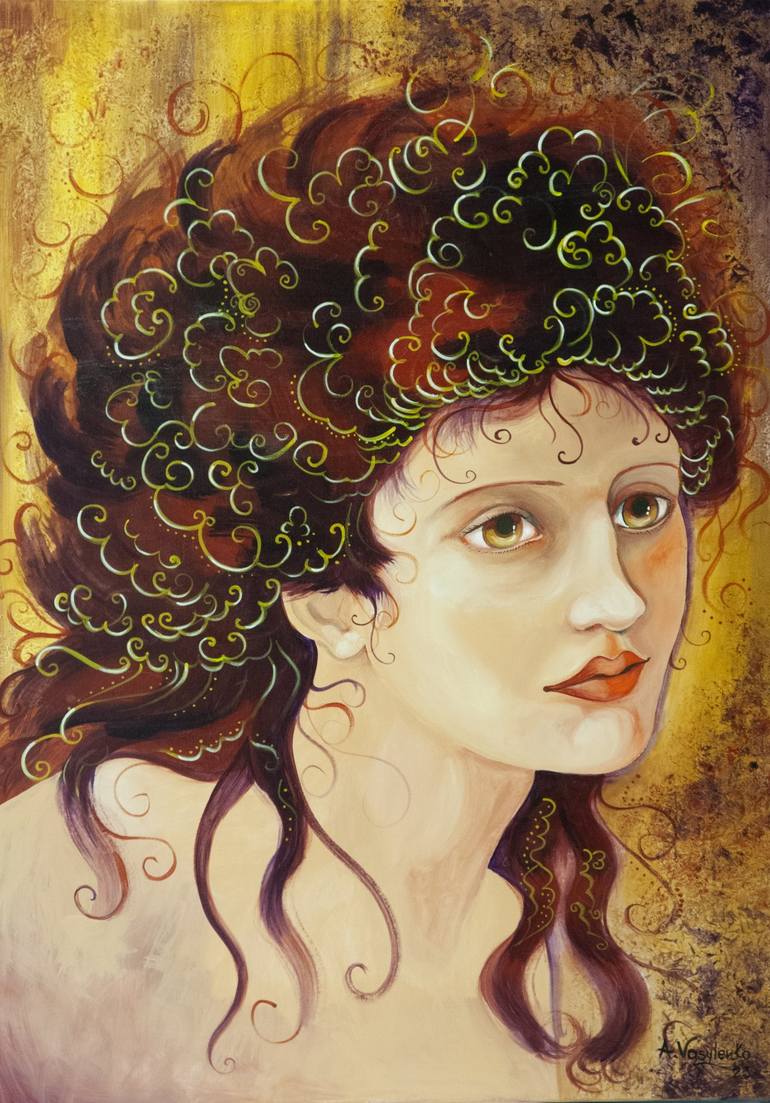 The work evokes the sweet and naive beauty of a young girl who looks towards the future with hopeful happiness.