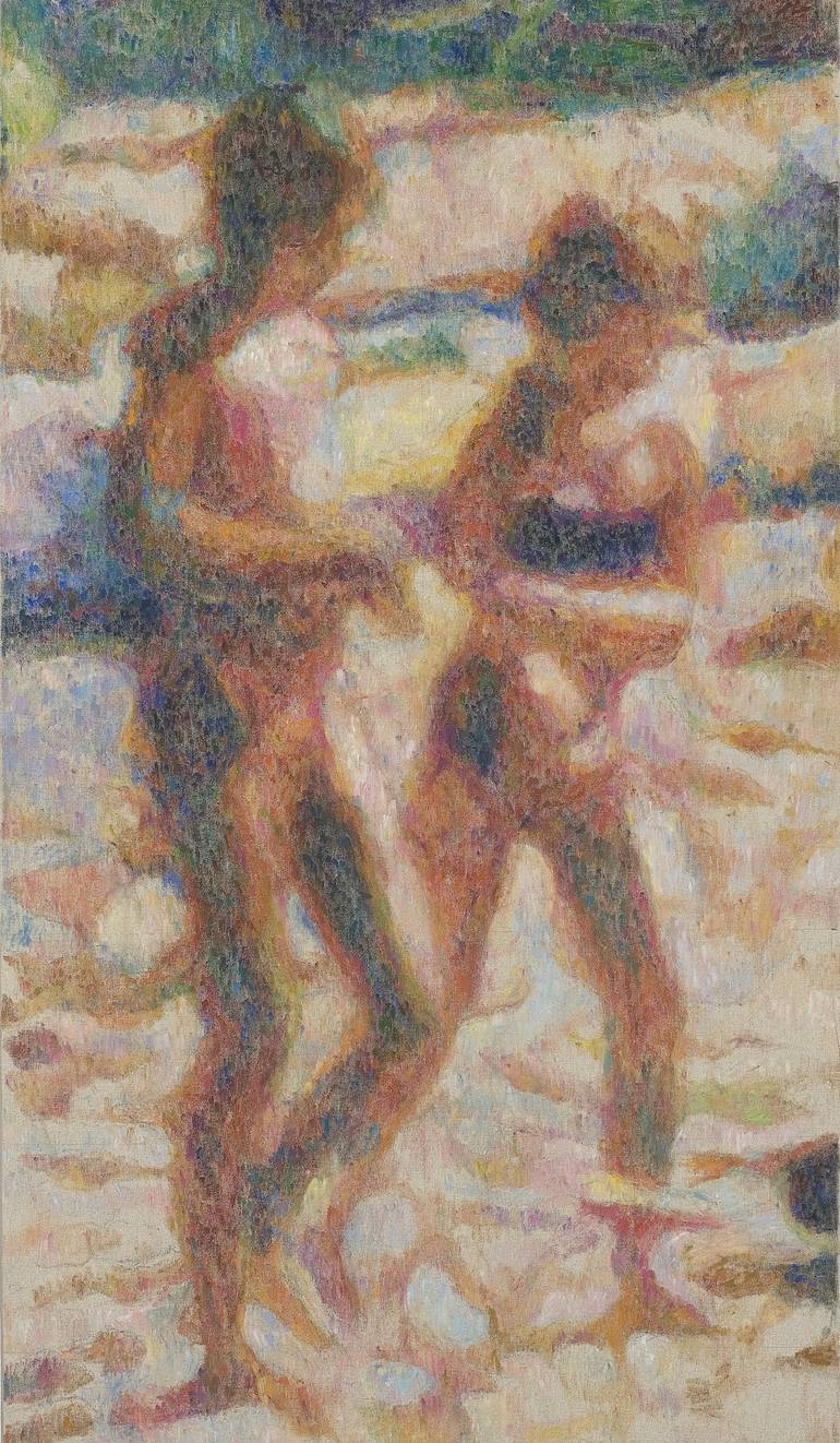The bathers came out of the water like Adam and Eve. Painted on a transparent primed canvas with a rough structure with the highest quality oils. Matte effect.
