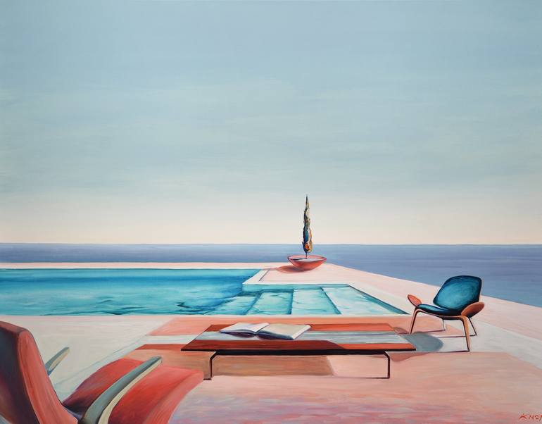 Rafal Knop - born in 1970 r. in Zywiec Poland. Rafał Knop is a painter, passionate about the art of antiquity and surrealism, who loves Tuscany. For several years, he has divided his time between Poland and Tuscany, where every year he organizes artistic Plein-Airs for amateur and professional artists and and Residenza d'Arte. A painter who in his paintings transforms the tendencies of the era - hasty, thoughtless and bright, in which reality becomes an imitation and a pretense. Drawing directly from commercialized culture (swimming pool as an indicator of luxury and a symbol of escapism), it goes beyond its borders, expressing the desire for silence. His paintings are idyllic shots of women's bodies, minimalistic captures of props such as a lonely palm or an unfurled umbrella, but also sublimated, futuristic architecture with elements of huge windows, labyrinths, stairs leading to nowhere, and finally furniture - empty tables, chaise longues and chairs (the presence of the absent) . The aura of the works is created by their light and colors, maintained in shades of ultramarine, pale purples, whites and powdery roses. The immobility of these irrationally sensual performances remains in the memory for a long time, evoking extreme emotions and turning the obvious into the non-obvious. The Swimming Pool series was inspired by the style of the 1960s-70s, the atmosphere of Edward Hockney's paintings from the L.A. series. Swimming Pool and, above all, feminine beauty.