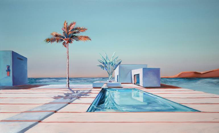 Painting from the new series by Rafał Knop, "The Swimming Pool", are frames in a modern perspective, showing the beauty of a woman, characters set in minimalist landscapes. In several works from this series, the main protagonist is the title Pool, which is the dominant feature of the painting's comp...