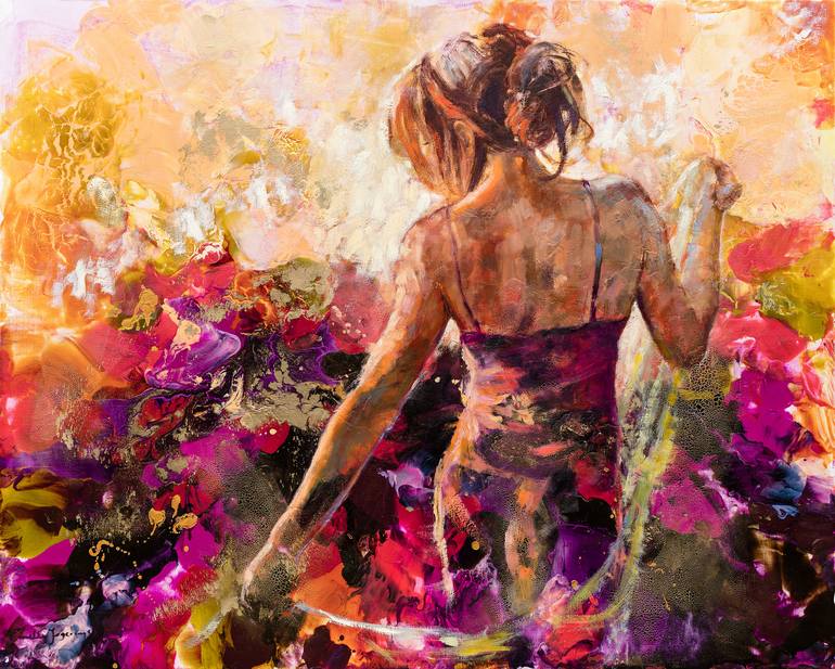 This painting is inspired by the colorful lights of the impressionism translated to the present. I started with an abstract background in acrylics and inks with some different mediums. A lot of interesting details appear after drying. And after this process I select a pose from one of my models that...