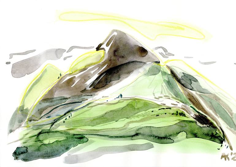 "Mountains" is a captivating mixed media piece that combines watercolor and wax crayon to create a semi-abstract portrayal of the Swiss Alps. Measuring 29.7 x 21 cm (11.7 x 8.3 inches), this artwork offers a unique blend of serene green-grey tones, reflecting the tranquil beauty of nature. Inspired ...