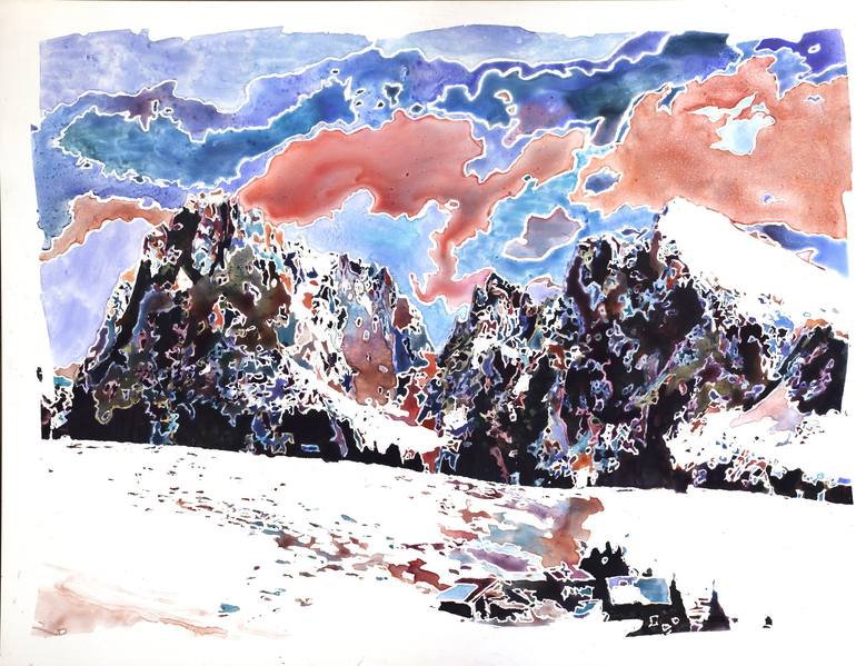 Switzerland Alps snow scene watercolor painting- Swiss Alps watercolor landscape artwork 20x26" watercolor on YUPO synthetic. Sealed with UV Archival Varnish. Hand signed by artist (not pictured). Unframed. Painted by artist Ryan Fox. Ryan Fox is a signature member of the American Watercolor ...