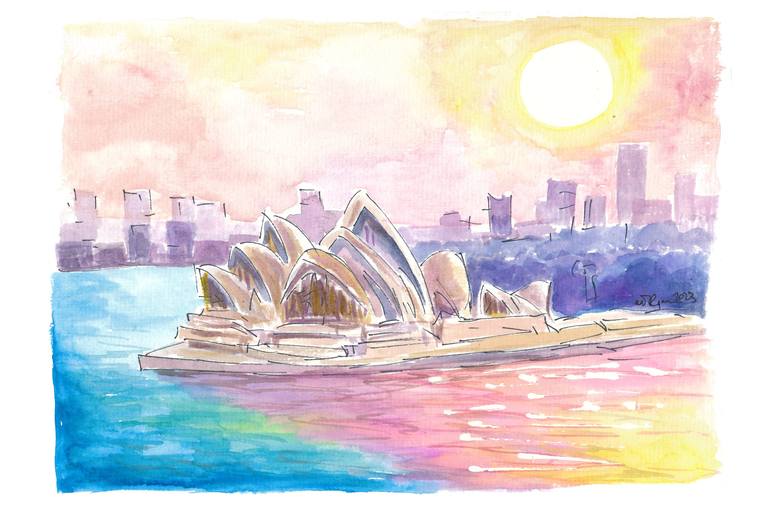 Sydney Australia Sunset with Opera and Downtown - watercolor on paper