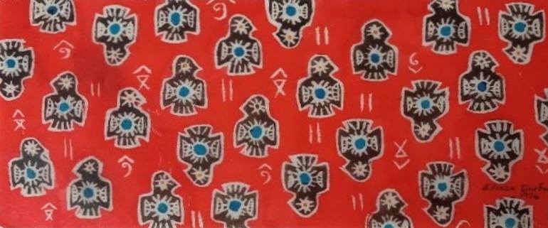 "Symbol" is a captivating watercolor painting on paper, created in 1976. The artwork is in excellent condition and showcases a compelling arrangement of patterns, reflecting elements of contemporary, illustration, and symbolism styles. This small painting features a striking palette of red, brown, ...