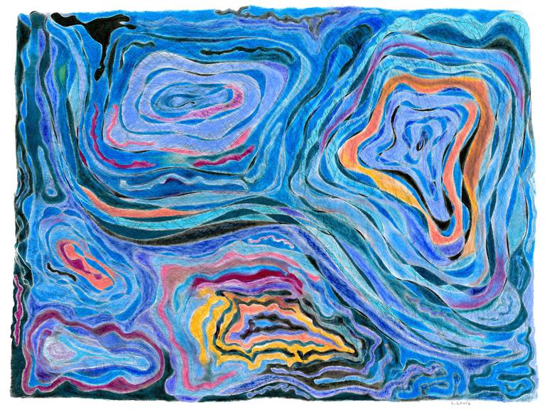 'Tempest' is part of a series called 'Rain, Wave, Land, Sky' and represents a mass of swirling air in a rainbow of blues and brilliant hues. The power and majesty of a weather phenomenon is depicted romantically in brilliant stained-glass colors. It attempts to capture the spiritual uplift of the ...