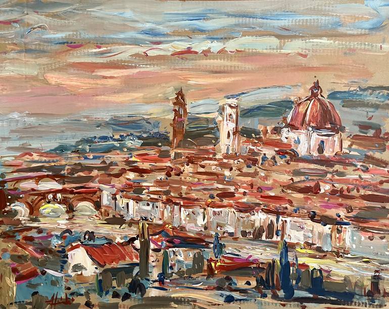 This October in Florence , view with Duomo view from Piazzale Michelangelo Firenze ( Italy ) from the painters corner. Professional acrylic colors on a painting cartoon panel. Both sides signed. Year 2022. Firenze, Italy. Original Created:2022 © 2022 Altin Furxhi All rights reserved