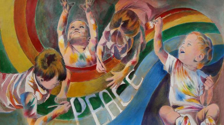 A work in figurative expressionist style inspired by a supreme symbol of peace, interpreted through the pure and unique joy of children intent on painting the well-known flag and, drenched in its riot of colors, return to us an intimate hope for peace. Particularly through the infant who, extending ...