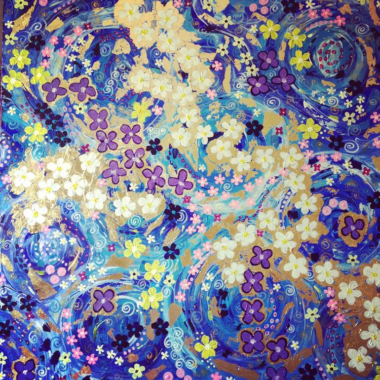 Acrylics,metallics, fine glitters and gold leaf on canvas. Edges are painted so that no framing is needed. This painting has as its background my distinctive swirls with flowers and gold leaf in random intuitive patterns on the surface. Inspired by my love of flowers and Klimt.